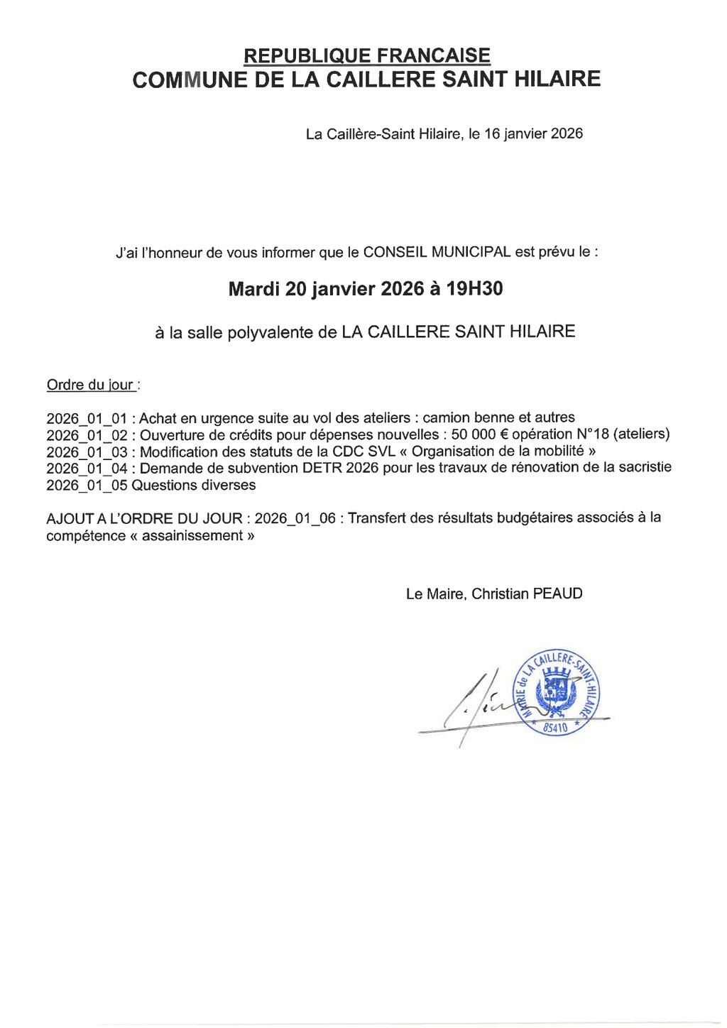 Le prochain Conseil Municipal de La CaillĂšre-Saint-Hilaire se tiendra le mardi 20 janvier 2026 Ă 19h30 Ă la salle polyvalente.