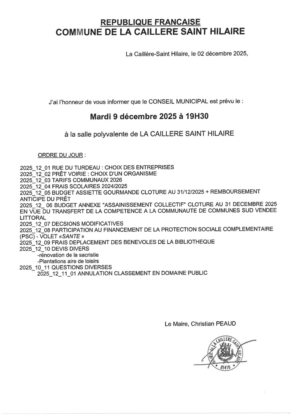 Le prochain Conseil Municipal de La CaillÚre-Saint-Hilaire se tiendra le mardi 9 décembre 2025 à 19h30 à la salle polyvalente.