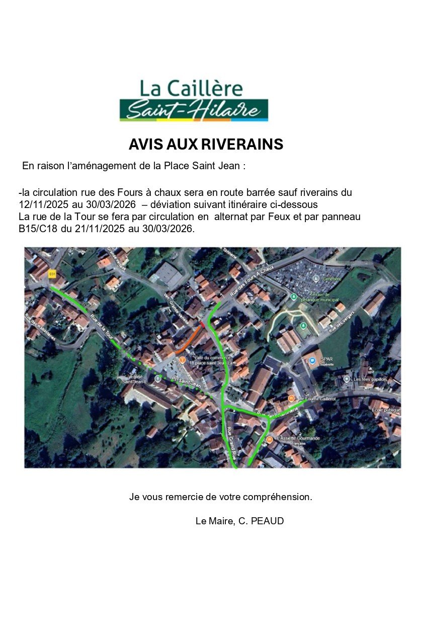 AVIS AUX RIVERAINS - PLACE SAINT JEAN / RUE DES FOURS Ă CHAUX / RUE DE LA TOUR đŁ