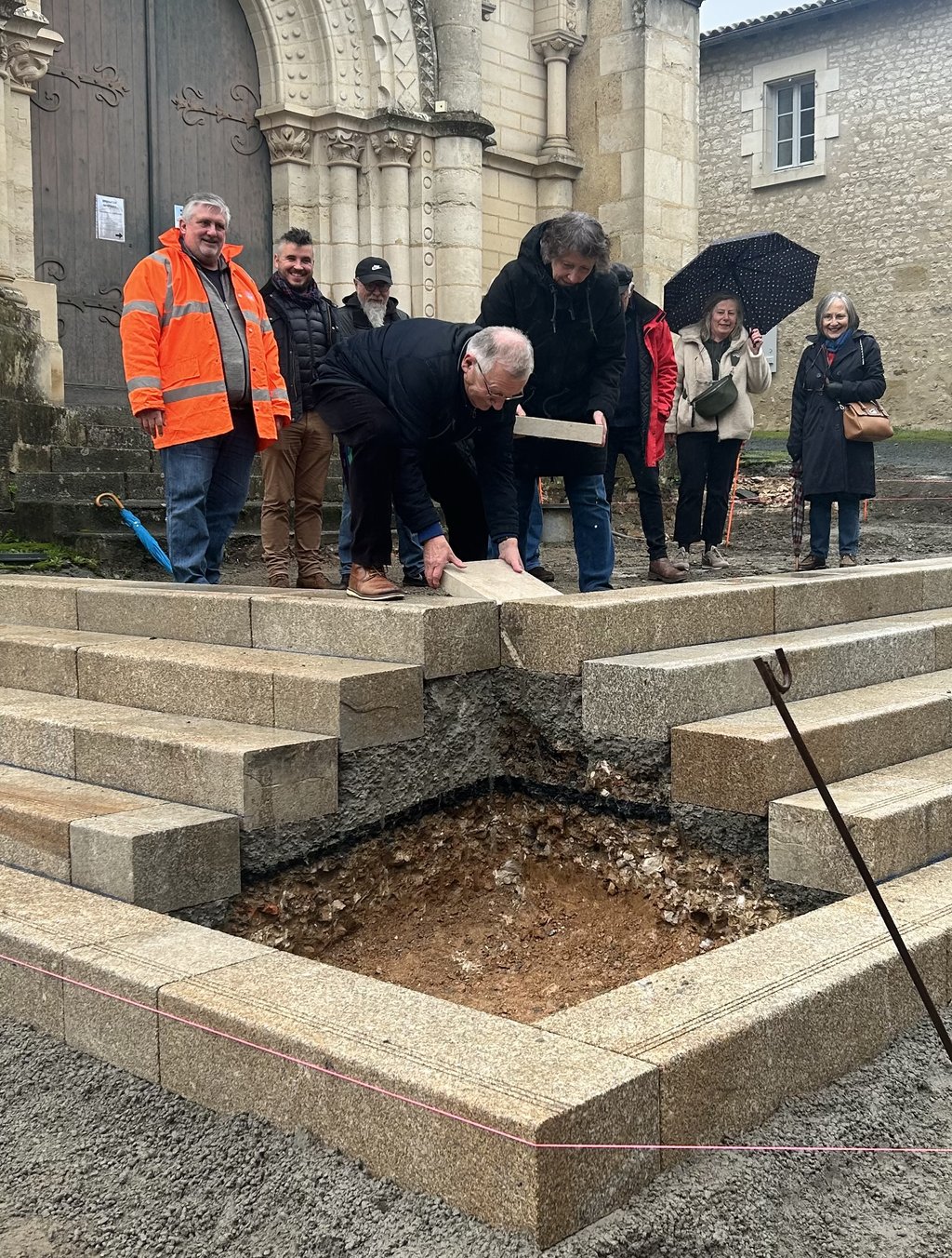 Ce vendredi 28 novembre 2025, le maire 👨💼 et le conseil municipal 🏛️ ont posé la première pierre 🧱 du futur aménagement de la place Saint-Jean 📍.