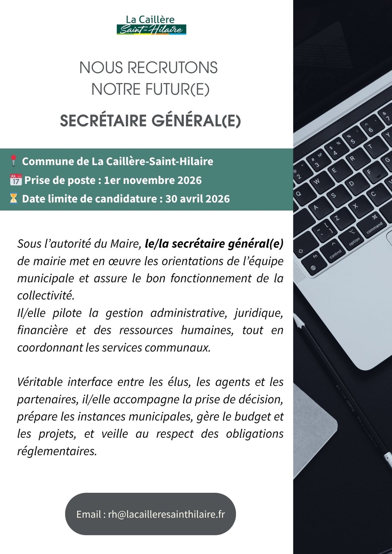 Nous recherchons notre futur(e) Secrétaire Général(e) de mairie.