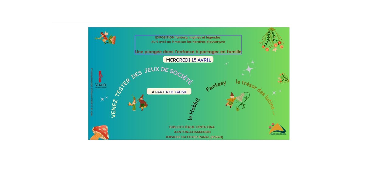 Durant les vacances scolaires, le mercredi 15 avril, à partir de 14h3, l'équipe de la bibliothèque proposera un temps de partage autour de jeux de société tels que le Hobbit, le trésor des lutins, etc...